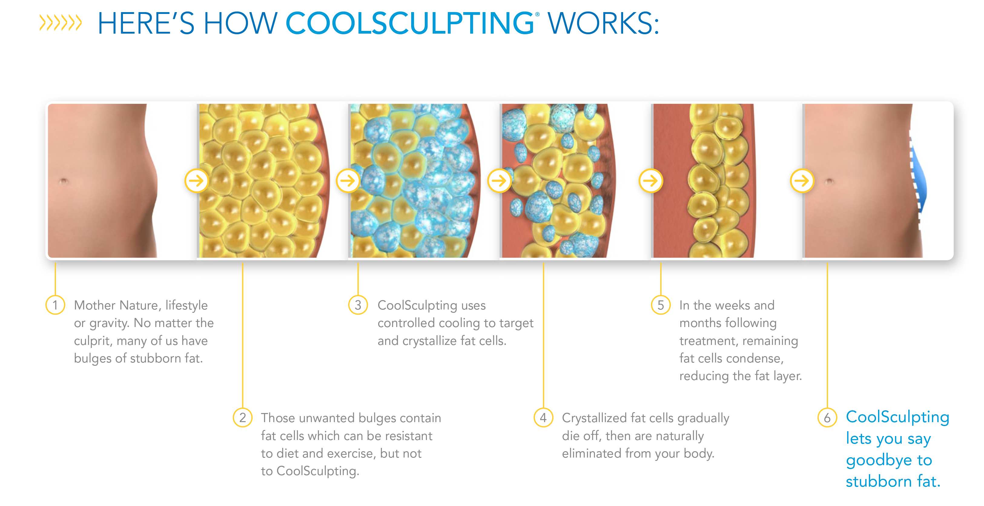 Approved by the FDA, CoolSculptingⓇ is the only body contouring technology of its kind that utilizes carefully controlled cooling to effectively and safely target fat cells in subcutaneous tissue. Once the CoolScultping procedure freezes these fat cells, the body naturally eliminates them for good, providing a slimmer contour.CoolSculptingⓇ is a cutting-edge fat-freezing system that can safely and effectively reduce stubborn fat in numerous areas, including the: